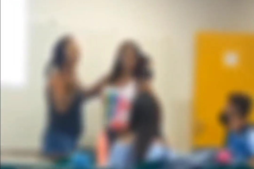Nas imagens, é possível ver a mulher com uma blusa azul se direcionando à jovem. Um homem, aparentemente o professor, até tenta retirar da sala a mulher, que inicia as ameaças.