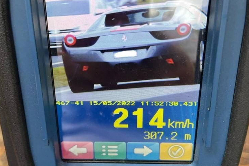 Uma Ferrari foi flagrada a 214 km/h pelo radar de mão operado por um policial militar rodoviário, na manhã deste domingo, 15, em uma operação contra rachas e carros superesportivos que circulam em alta velocidade em estradas paulistas.