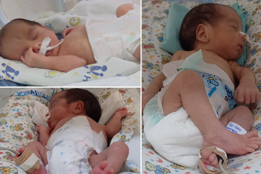 O primeiro a nascer foi Miguel, com 42 centímetros e 1,8 quilo. Gabriel veio na sequência, com 41 centímetros e 1,6 quilo; e por último, Rafael, com 40 centímetros e 1,5 quilo. Cada bebê foi gerado numa bolsa.