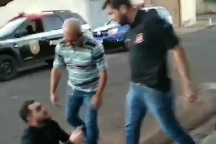 Tofetti chuta Lucas caído. Outra pessoa, aparentando ser investigador, tenta separá-los, mas o policial segue ofendendo o advogado. “Estou cansado de você me enfrentar na delegacia. Seu merda. Vai tomar no seu c*”.