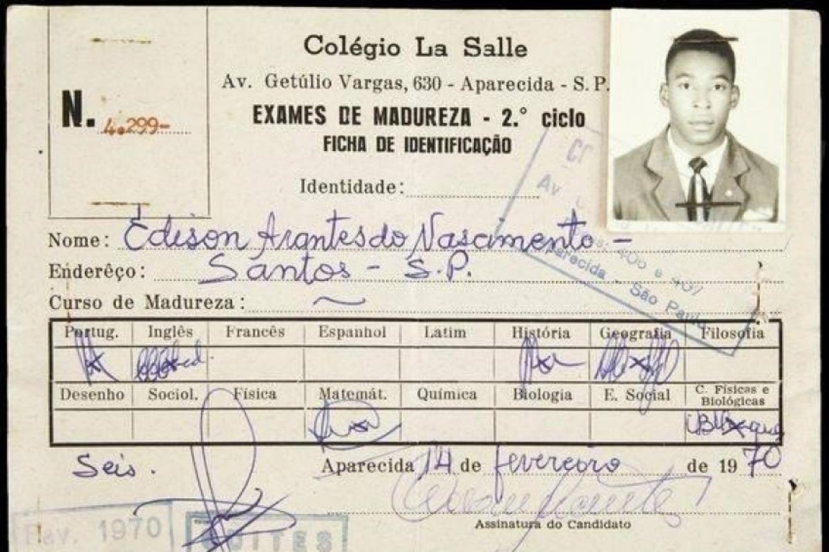 Boletim escolar do Colégio La Salle preenchido por Pelé mostra que ele fez exames de português, história, geografia, matemática e ciências físicas e biológicas em Aparecida. A data do documento é de 14 de fevereiro de 1970. Pelé passou em todas as matérias.