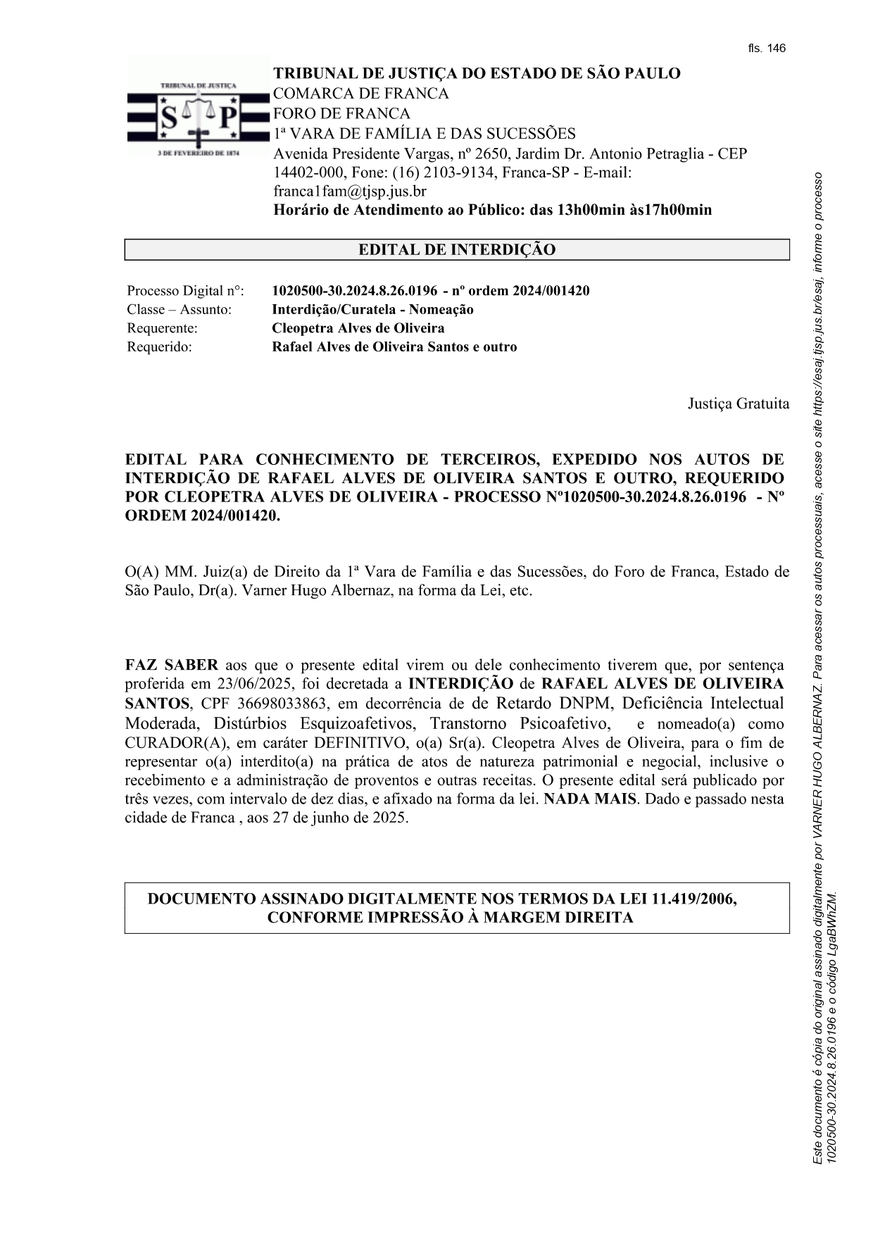 Edital Edital de Interdição - Processo nº. 1020500-30.2024.8.26.0196 Por | 11.07.2025 16h29 | Tempo de leitura: < 1 min Certificado: Google Cloud Facebook Whatsapp Twitter Comentários Comentários Enviar