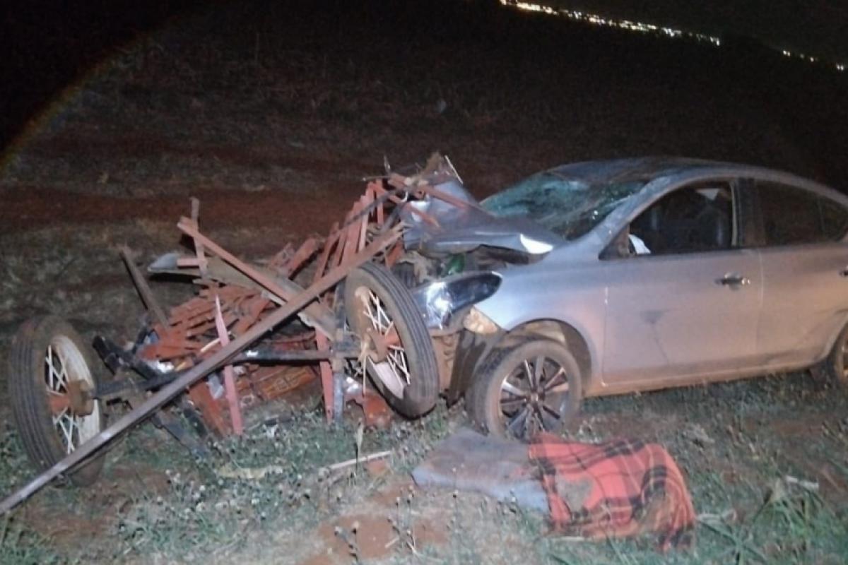 O motorista de um Nissan Versa, morador de Guaíra, bateu em uma carroça que circulava pela pista. Com o impacto, o carroceiro foi arremessado.