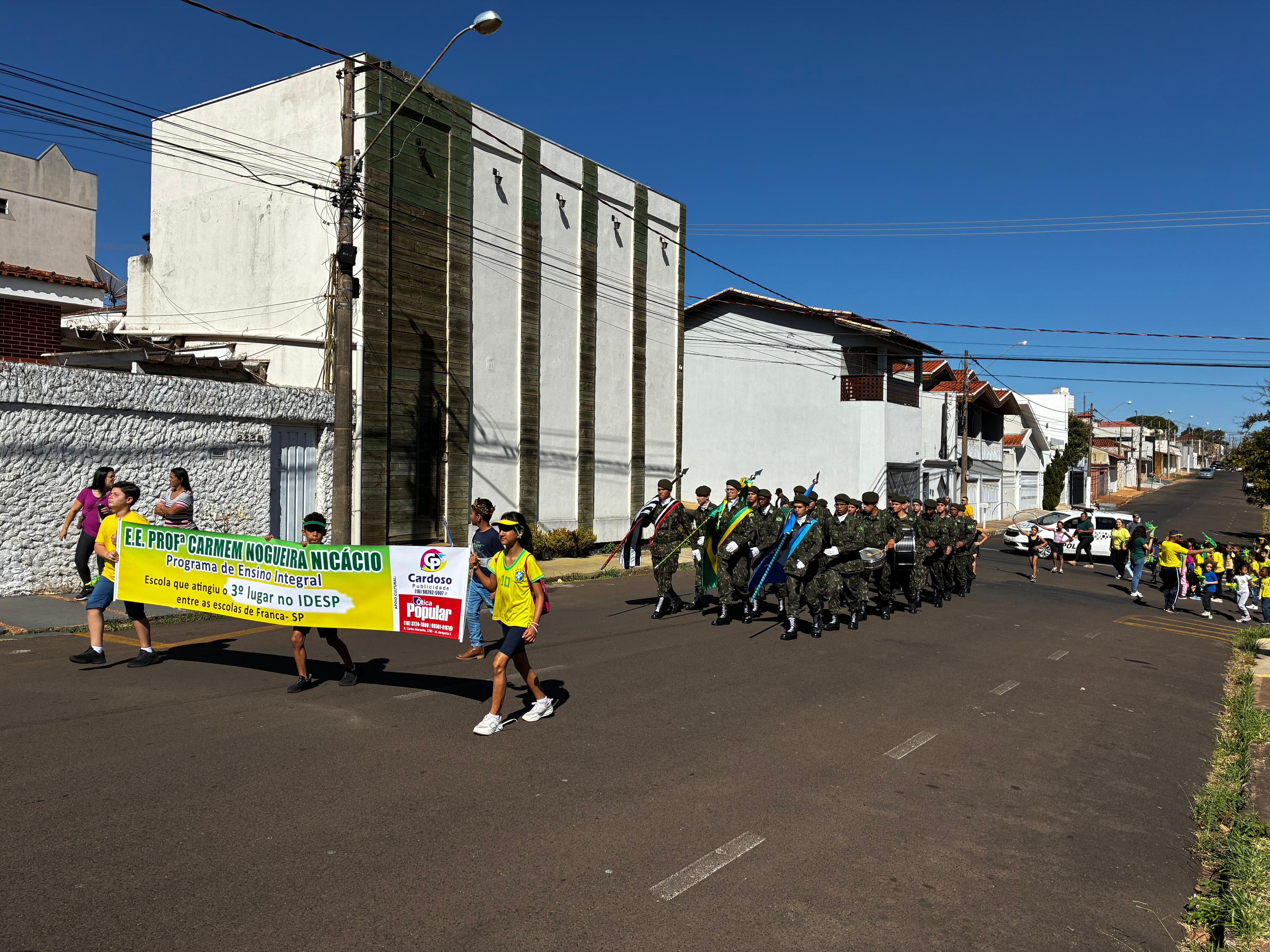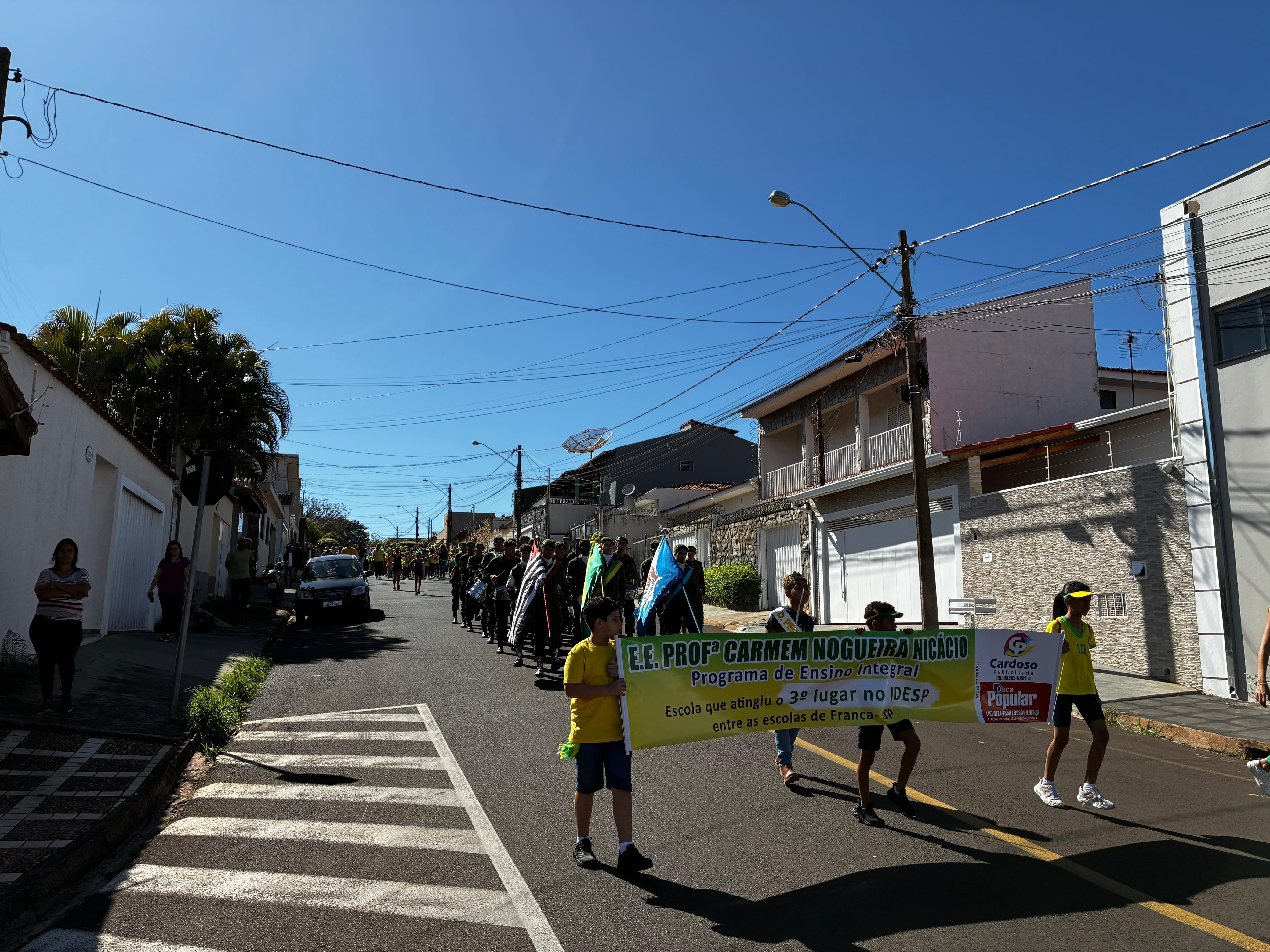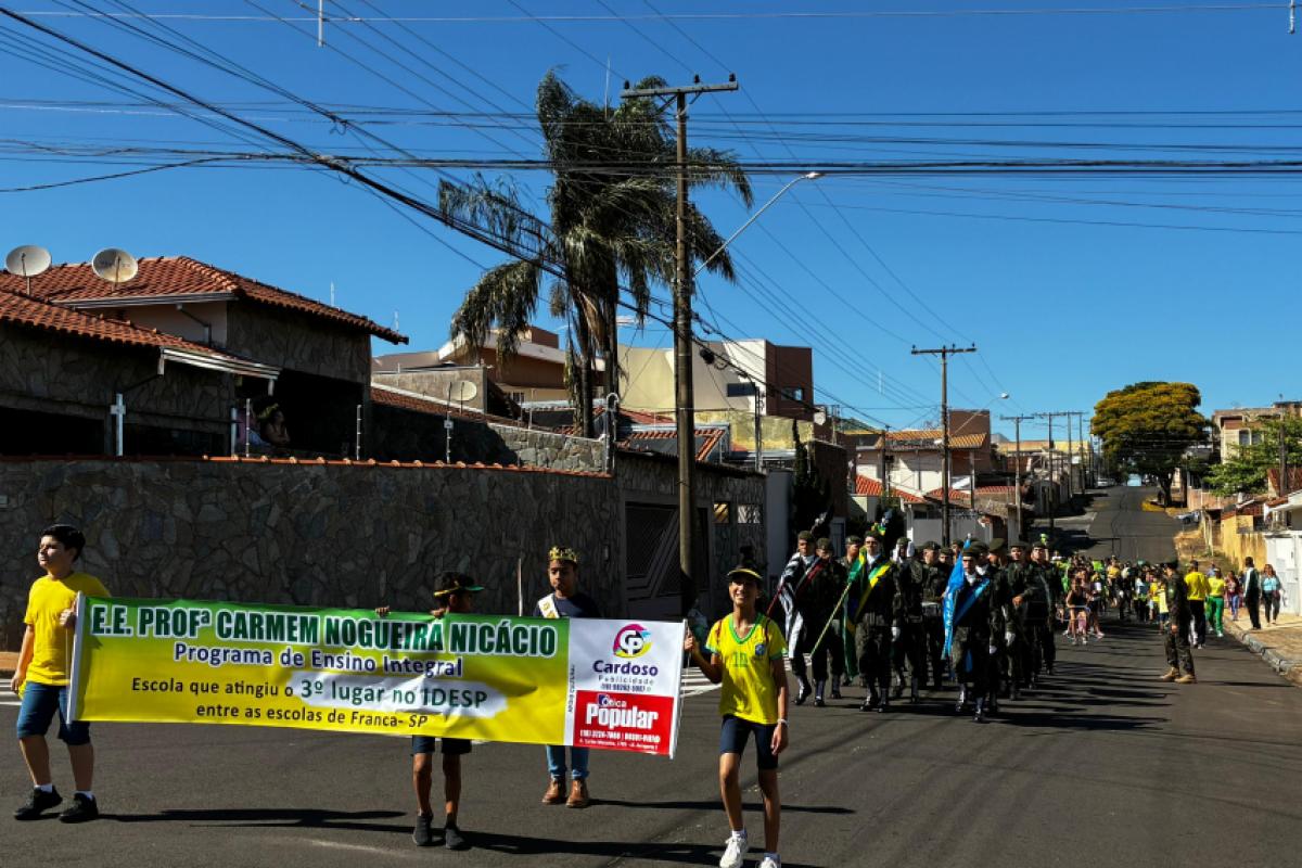 Alunos da Escola Estadual "Professora Carmem Nogueira Nicácio", na Jardim Paulista, em Franca, realizaram um emocionante desfile cívico na manhã desta sexta-feira, 5, em celebração à Semana da Pátria. Liderados por atiradores do Tiro de Guerra de Franca, os pequenos estudantes percorreram as ruas do bairro, atraindo aplausos e o carinho dos moradores.