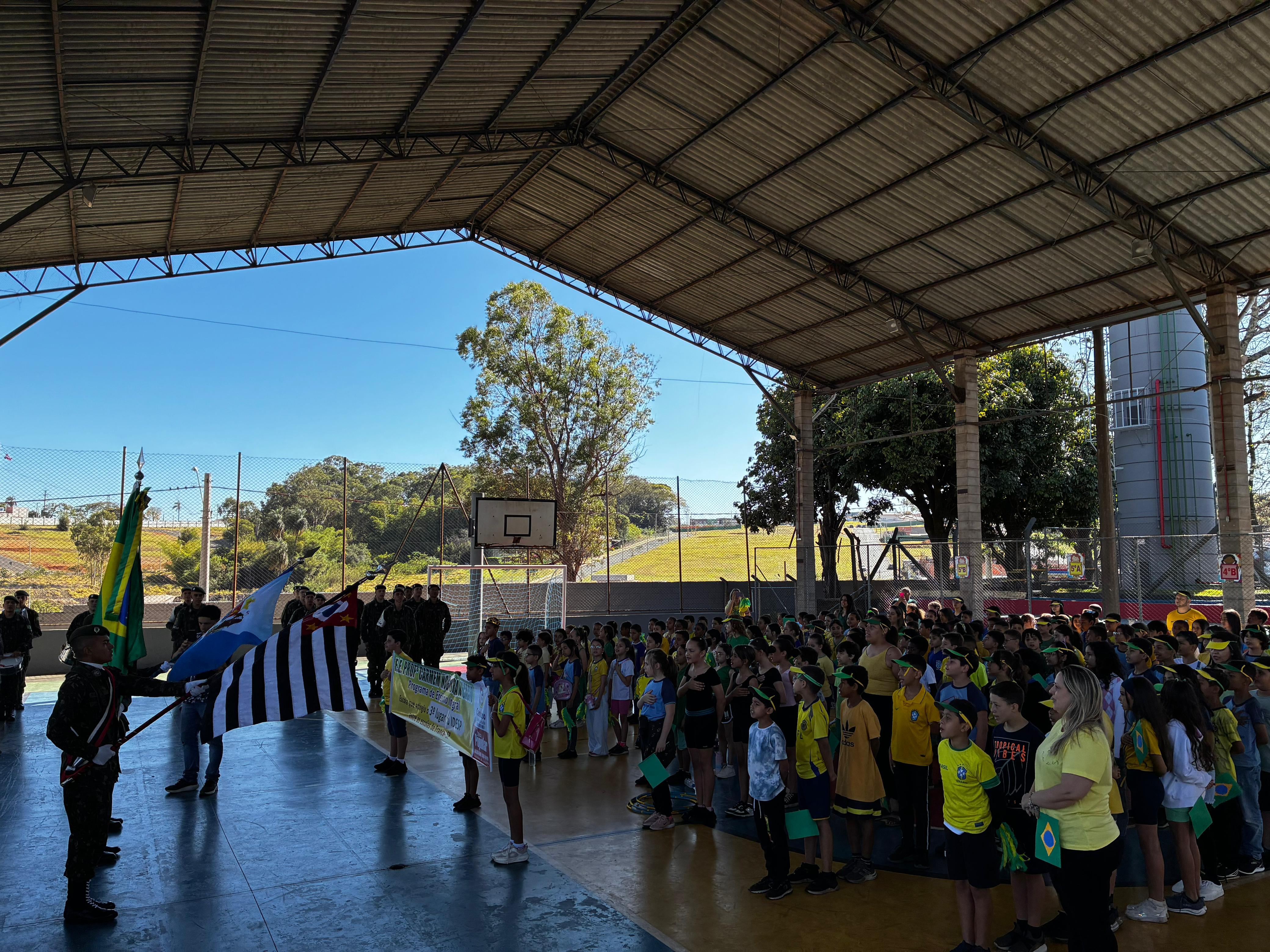 O evento começou às 9h, na quadra da escola, com uma solenidade que contou com a participação do subtenente Marcos Valeça, do Tiro de Guerra. Ele explicou às crianças a importância e o simbolismo da Independência do Brasil, antes que todos cantassem o Hino Nacional e o Hino da Independência.