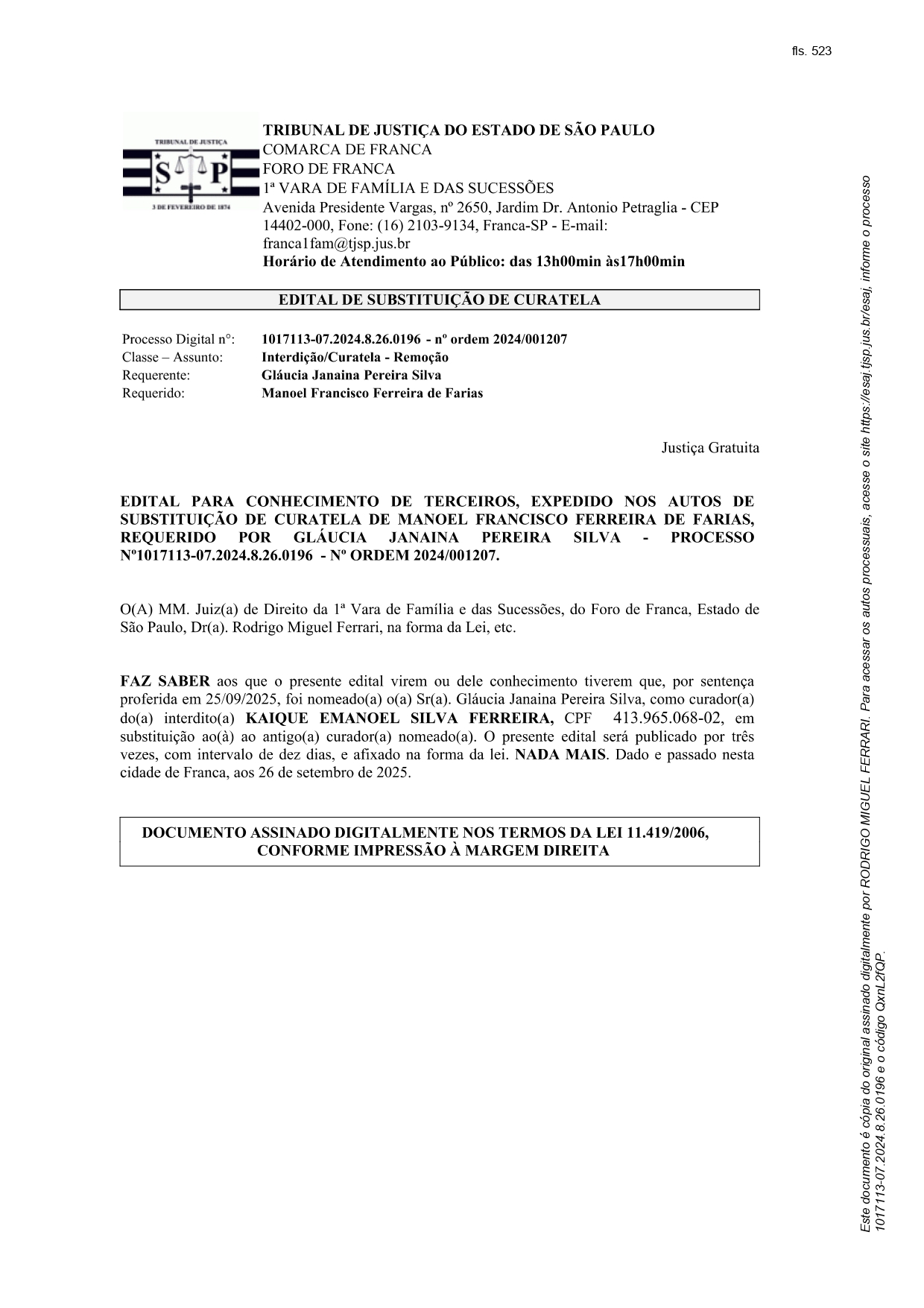 Edital Edital de Substituição de Curatela - nº de ordem 2024/001207 Por | 03.10.2025 09h21 | Tempo de leitura: < 1 min Certificado: Google Cloud Facebook Whatsapp Twitter Comentários Comentários Enviar