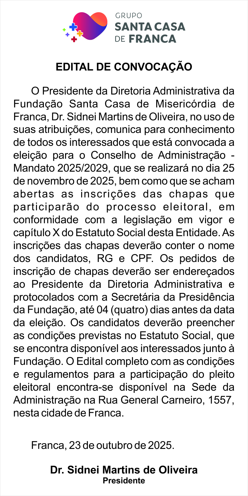 Edital Edital de Convocação - Santa Casa de Franca Por | 23.10.2025 07h00 | Tempo de leitura: < 1 min Certificado: Google Cloud Facebook Whatsapp Twitter Comentários Comentários Enviar