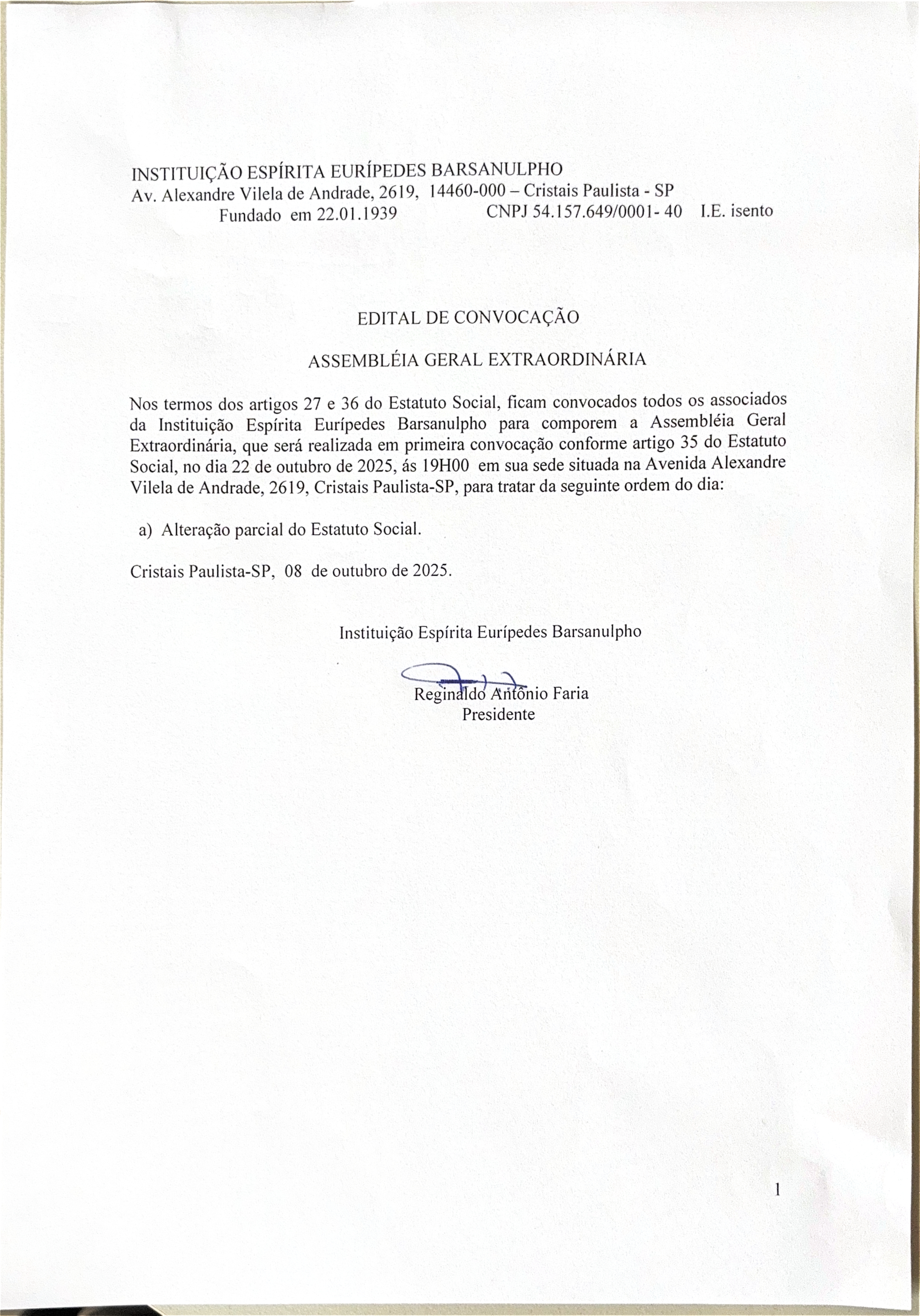 Edital Edital de Convocação de Assembleia Geral Extraordinária Por | 16.10.2025 09h44 | Tempo de leitura: < 1 min Certificado: Google Cloud Facebook Whatsapp Twitter Comentários Comentários Enviar