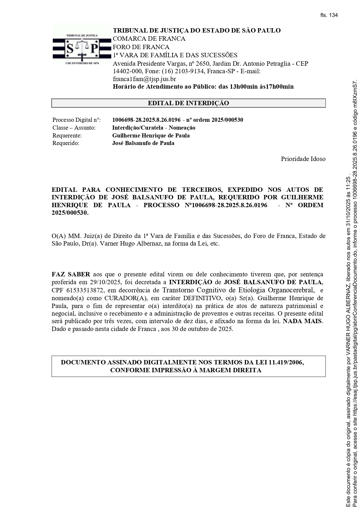 Edital Edital de Interdição - Processo nº. 1006698-28.2025.8.26.0196 Por | 10.12.2025 14h43 | Tempo de leitura: < 1 min Certificado: Google Cloud Facebook Whatsapp Twitter Comentários Comentários Enviar