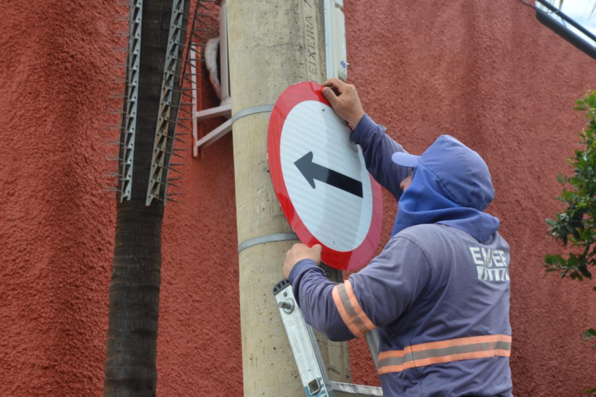 Sinalização sendo trocada em rua de Franca