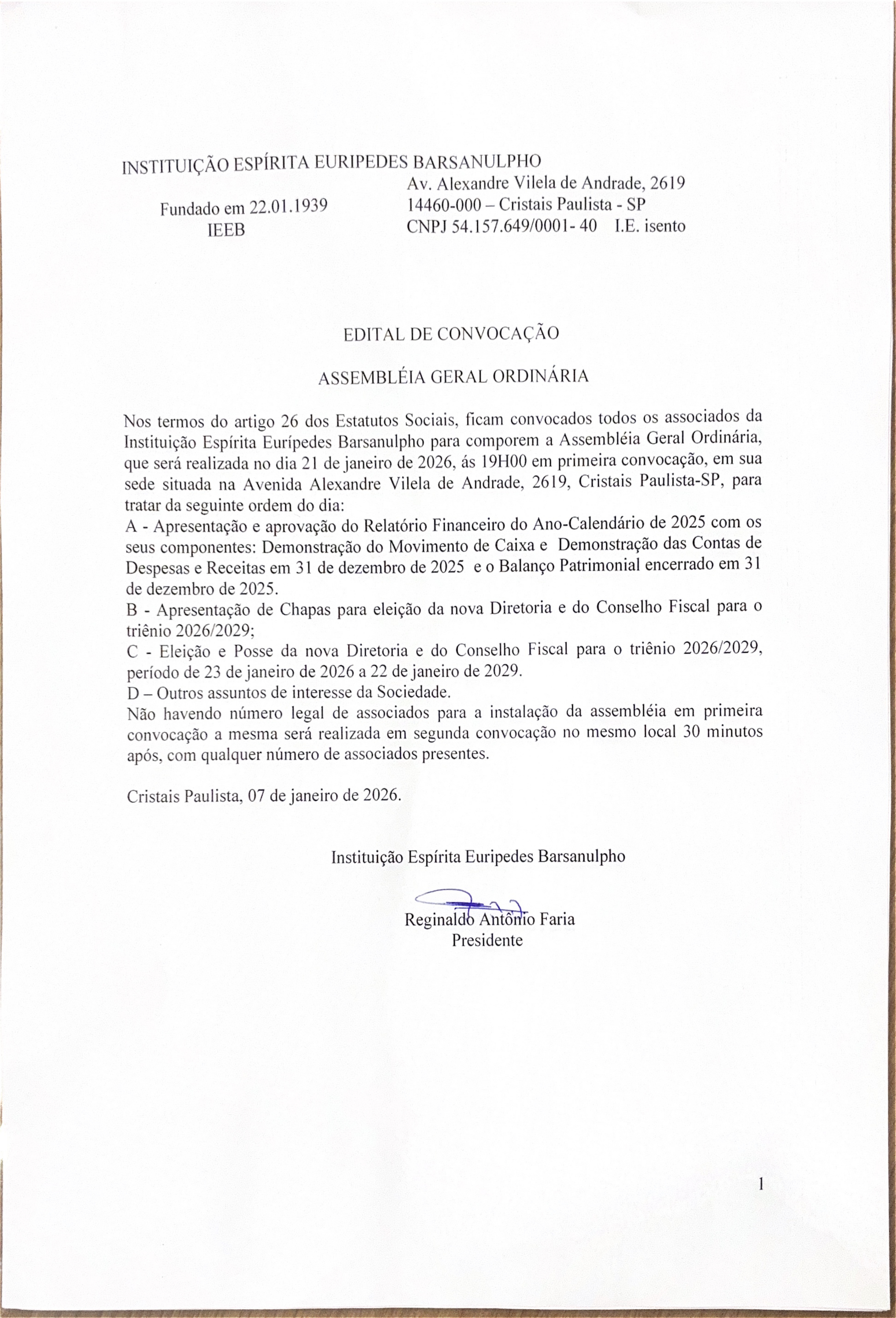 EDITAL DE CONVOCAÇÃO EDITAL DE CONVOCAÇÃO INSTITUIÇAO ESPIRITA EURIPEDES BARSANULPHO Por | 07.01.2026 13h04 | Tempo de leitura: < 1 min Certificado: Google Cloud Facebook Whatsapp Twitter Comentários Comentários Enviar