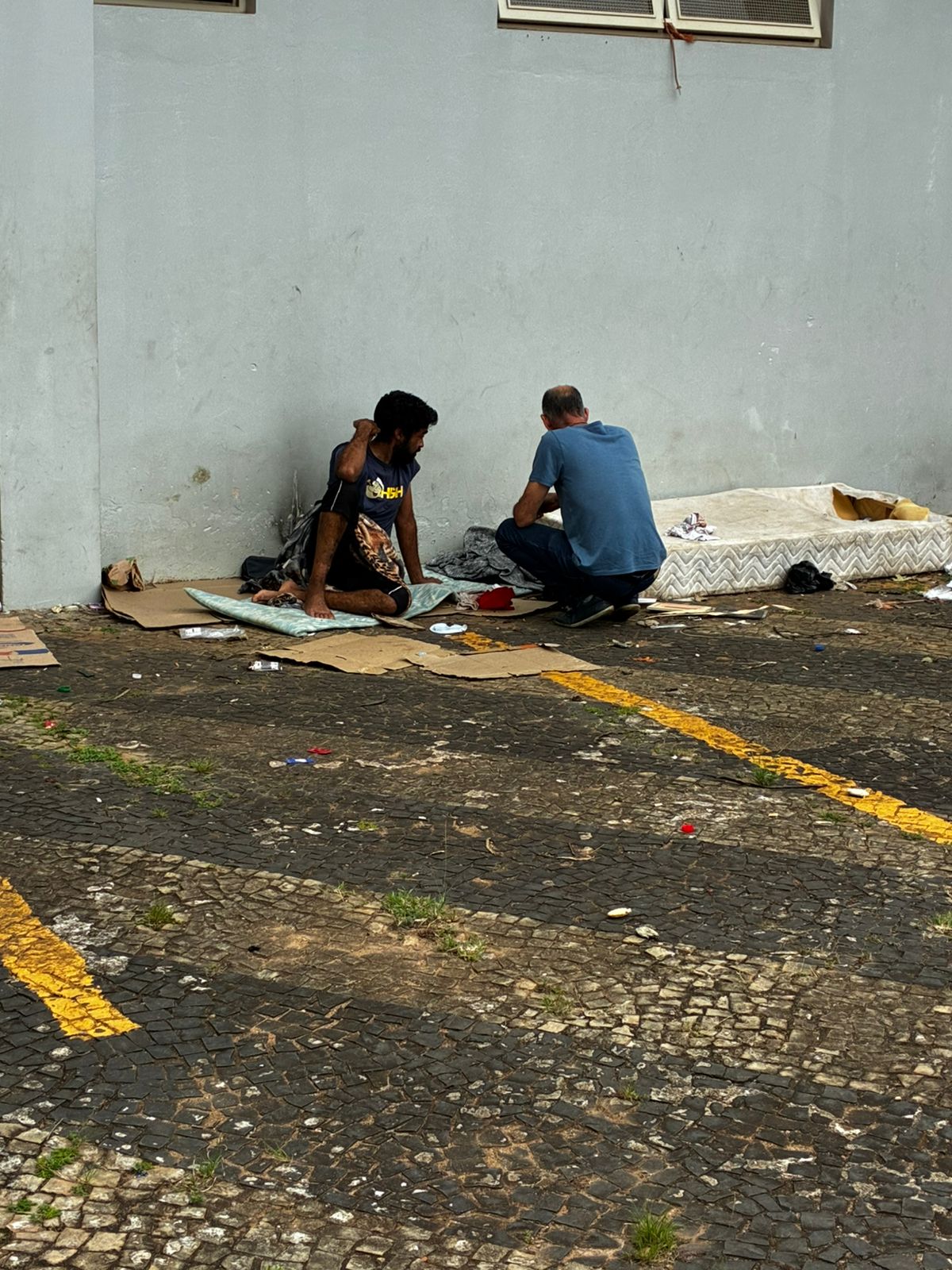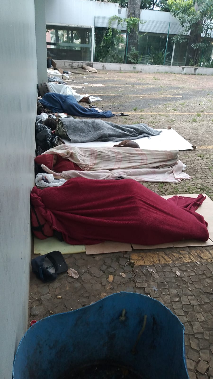 Colchões, papelões e panos são colocados diretamente no chão, próximos às paredes do terminal, onde elas se deitam para descansar. Cobertores e mantas são usados para proteção contra o frio, enquanto objetos pessoais permanecem espalhados pelo local, indicando permanência contínua.