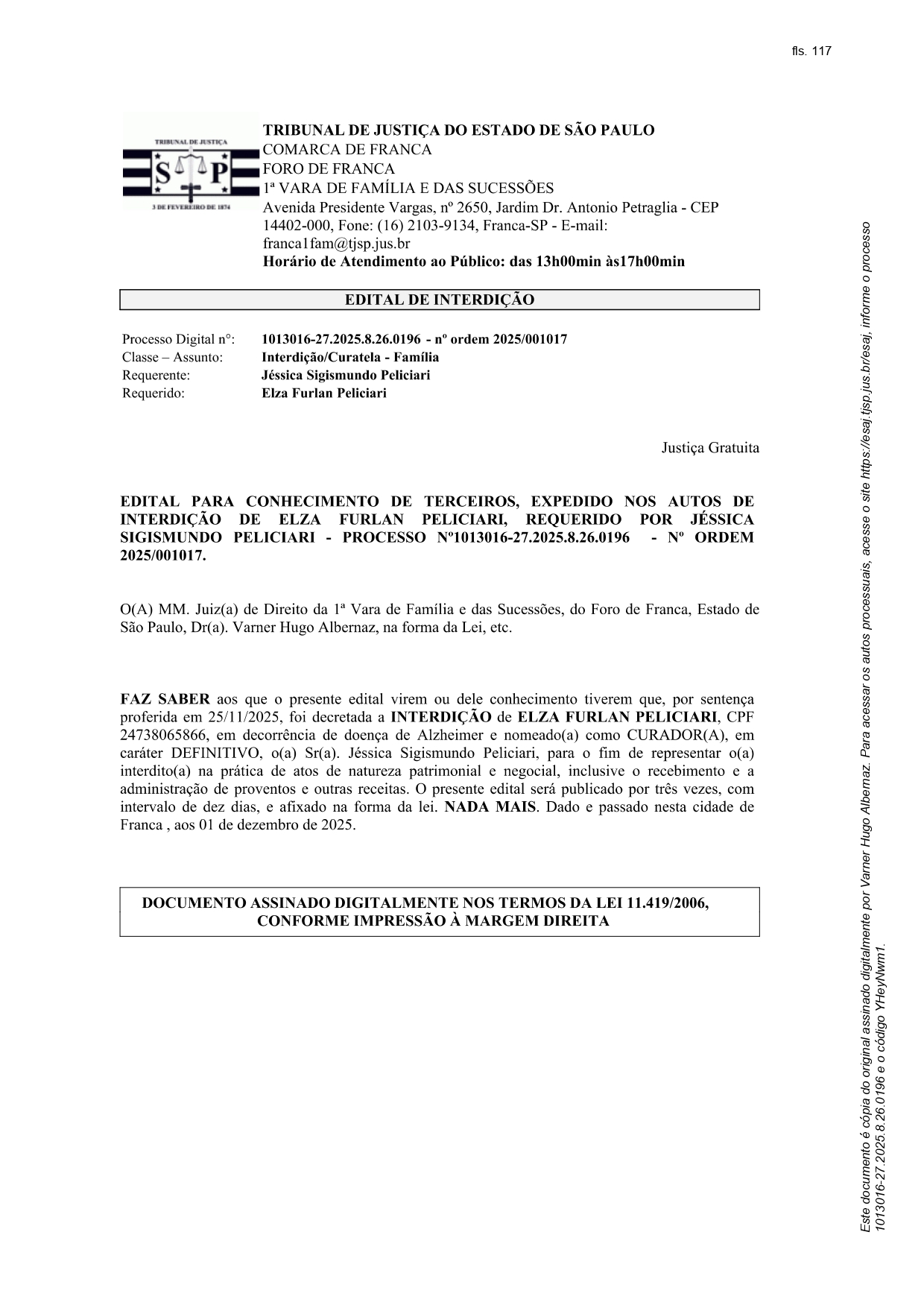 Edital Edital de interdição - Processo nº. 1013016-27.2025.8.26.0196 Por | 12.01.2026 11h14 | Tempo de leitura: < 1 min Certificado: Google Cloud Facebook Whatsapp Twitter Comentários Comentários Enviar