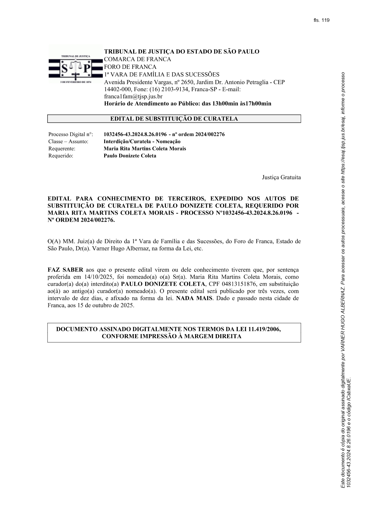 Edital Edital de Substituição de Curatela - nº de ordem 2024/002276 Por | 12.01.2026 16h11 | Tempo de leitura: < 1 min Certificado: Google Cloud Facebook Whatsapp Twitter Comentários Comentários Enviar