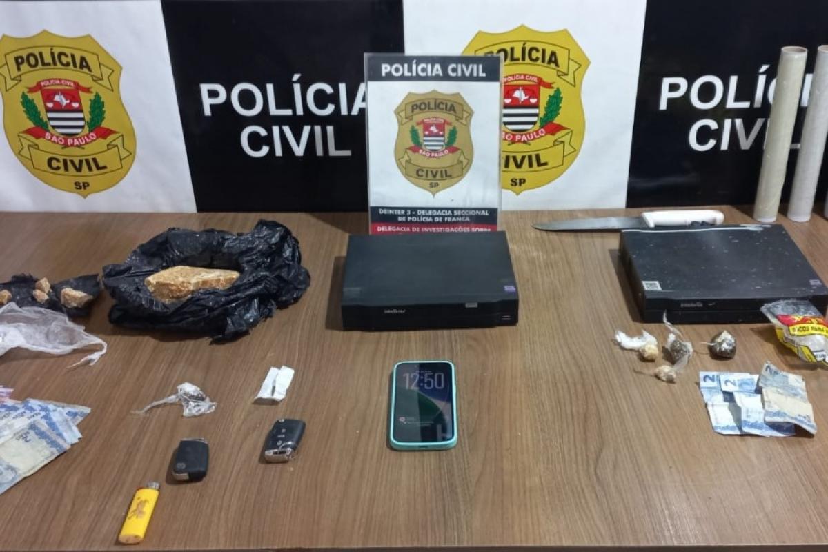 No primeiro endereço, na rua Antônio Alves da Silva, um jovem de 22 anos foi abordado. No local, os policiais encontraram uma porção média de pasta base de cocaína, um tijolo de crack e outras quatro porções da droga, escondidas em uma blusa de frio. Também foram apreendidos R$ 230 em dinheiro, um celular Apple e um equipamento de monitoramento (DVR).