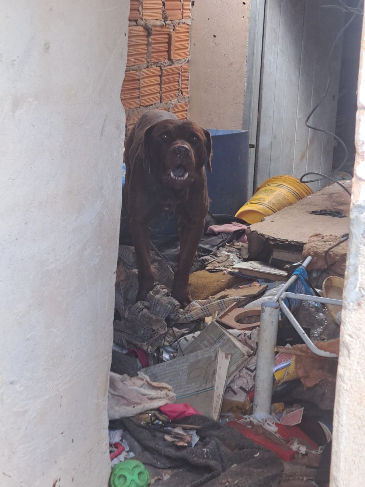Com a autorização da proprietária, os agentes entraram na residência e constataram a situação de maus-tratos. O cachorro foi encontrado sem água e sem comida, preso a uma corrente em um ambiente insalubre, com forte mau cheiro e grande quantidade de lixo acumulado tanto no interior do imóvel quanto no quintal.