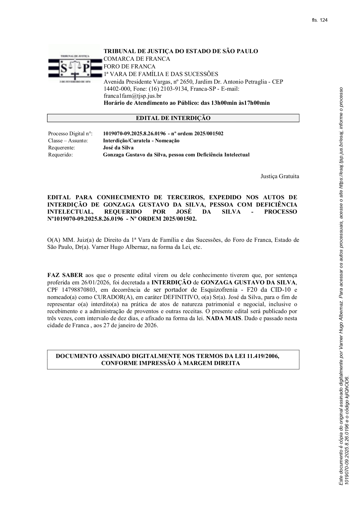 Edital Edital de Interdição - Processo nº. 1019070-09.2025.8.26.0196 Por | 28.01.2026 14h18 | Tempo de leitura: < 1 min Certificado: Google Cloud Facebook Whatsapp Twitter Comentários Comentários Enviar
