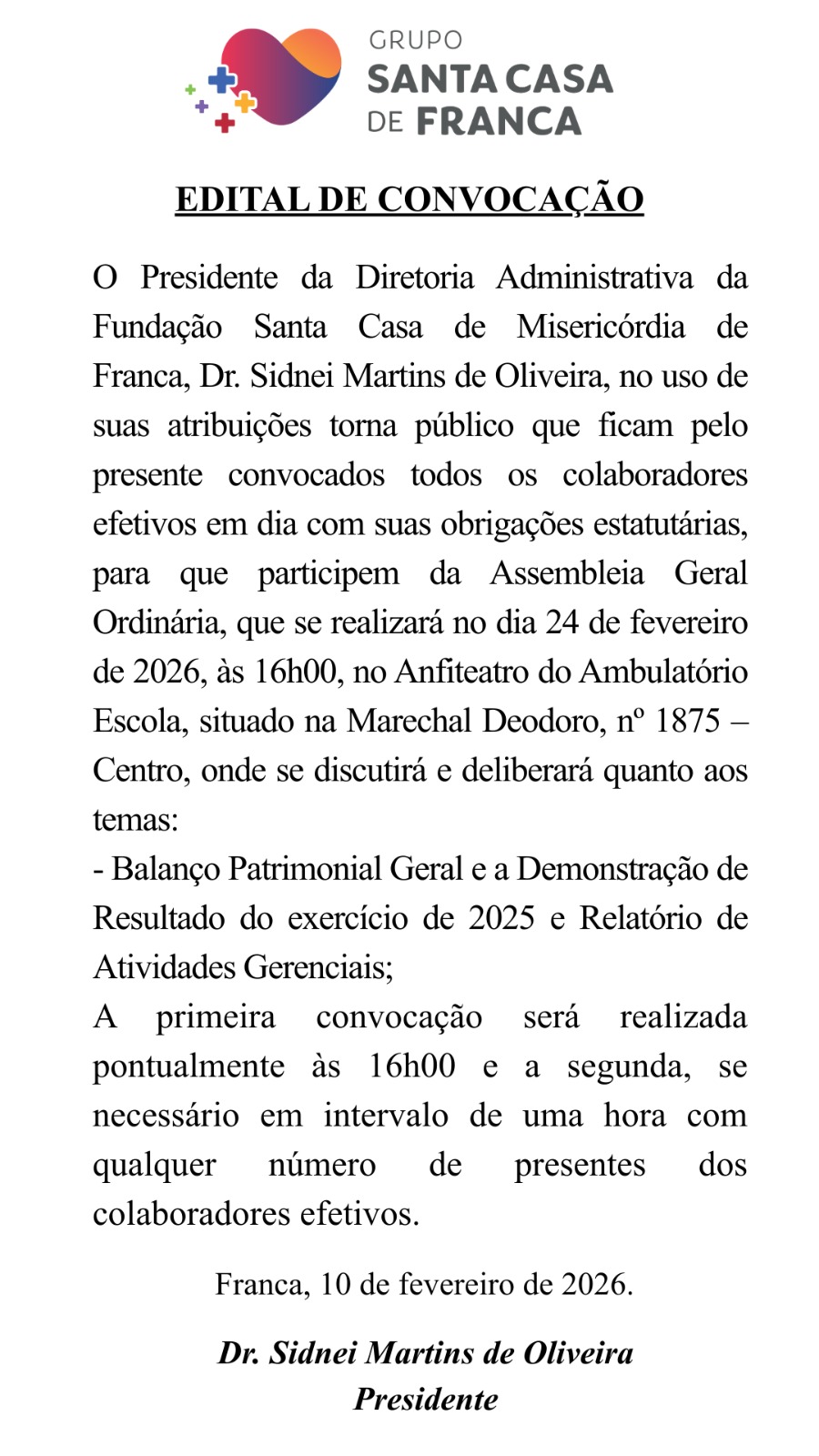 EDITAL EDITAL DE CONVOCAÇÃO SANTA CASA Por | 10.02.2026 07h00 | Tempo de leitura: < 1 min Certificado: Google Cloud Facebook Whatsapp Twitter Comentários Comentários Enviar