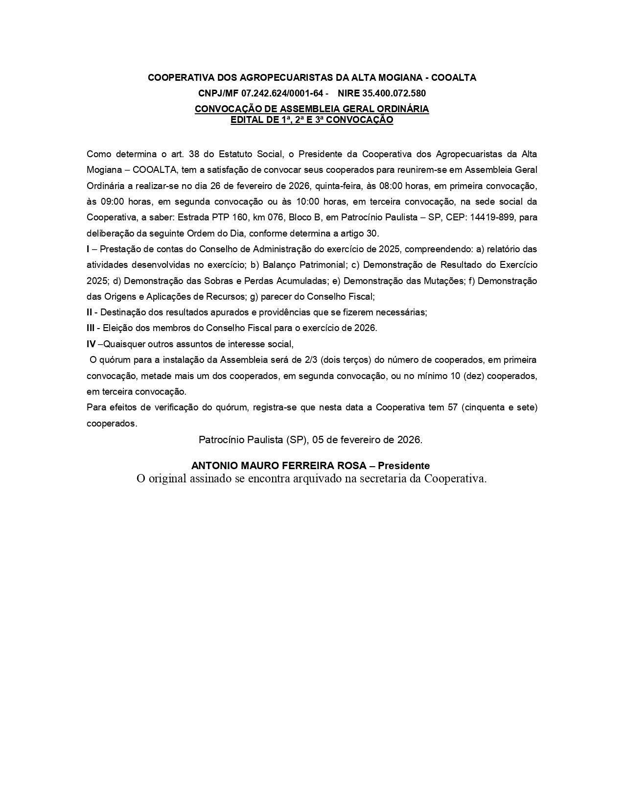 Edital EDITAL DE CONVOCAÇÃO DE ASSEMBLEIA GERAL ORDINARIA COOALTA Por | 11.02.2026 07h00 | Tempo de leitura: < 1 min Certificado: Google Cloud Facebook Whatsapp Twitter Comentários Comentários Enviar