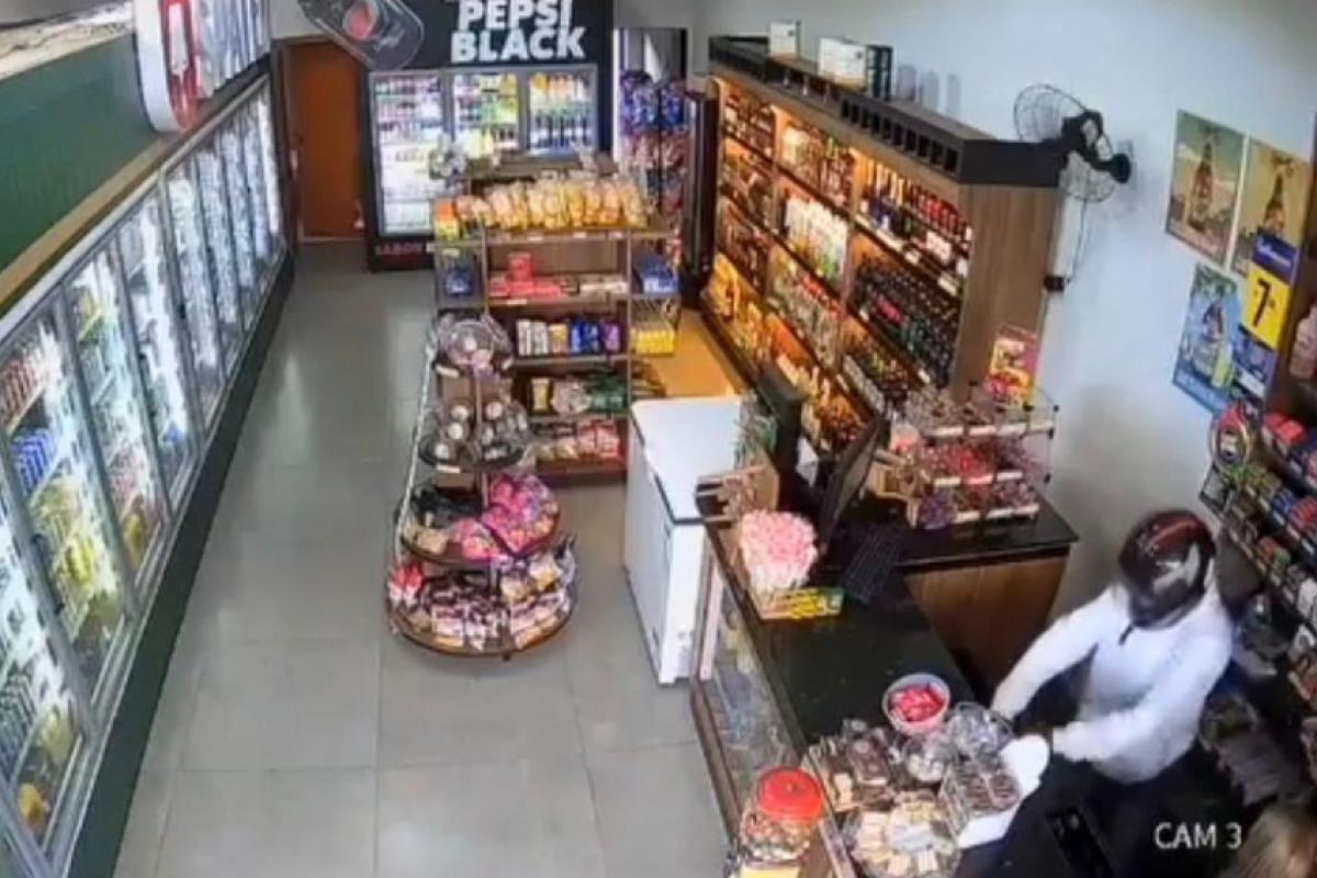 O crime foi registrado por câmeras de segurança do estabelecimento. Nas imagens, é possível ver um homem chegando ao local usando capacete. Ele se aproxima do caixa, aborda a funcionária e, sob ameaça, exige o dinheiro.