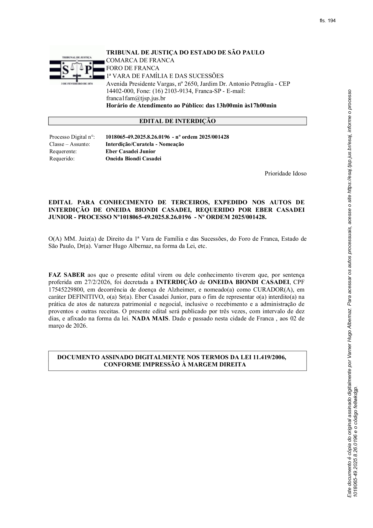 Edital Edital de Interdição - Processo nº. 1018065-49.2025.8.26.0196 Por | 03.03.2026 08h56 | Tempo de leitura: < 1 min Certificado: Google Cloud Facebook Whatsapp Twitter Comentários Comentários Enviar