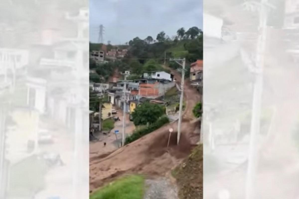 Imagens mostram que a enxurrada devastou uma parte do bairro. Três casas e 10 veículos foram diretamente atingidos, ainda de acordo com a corporação.