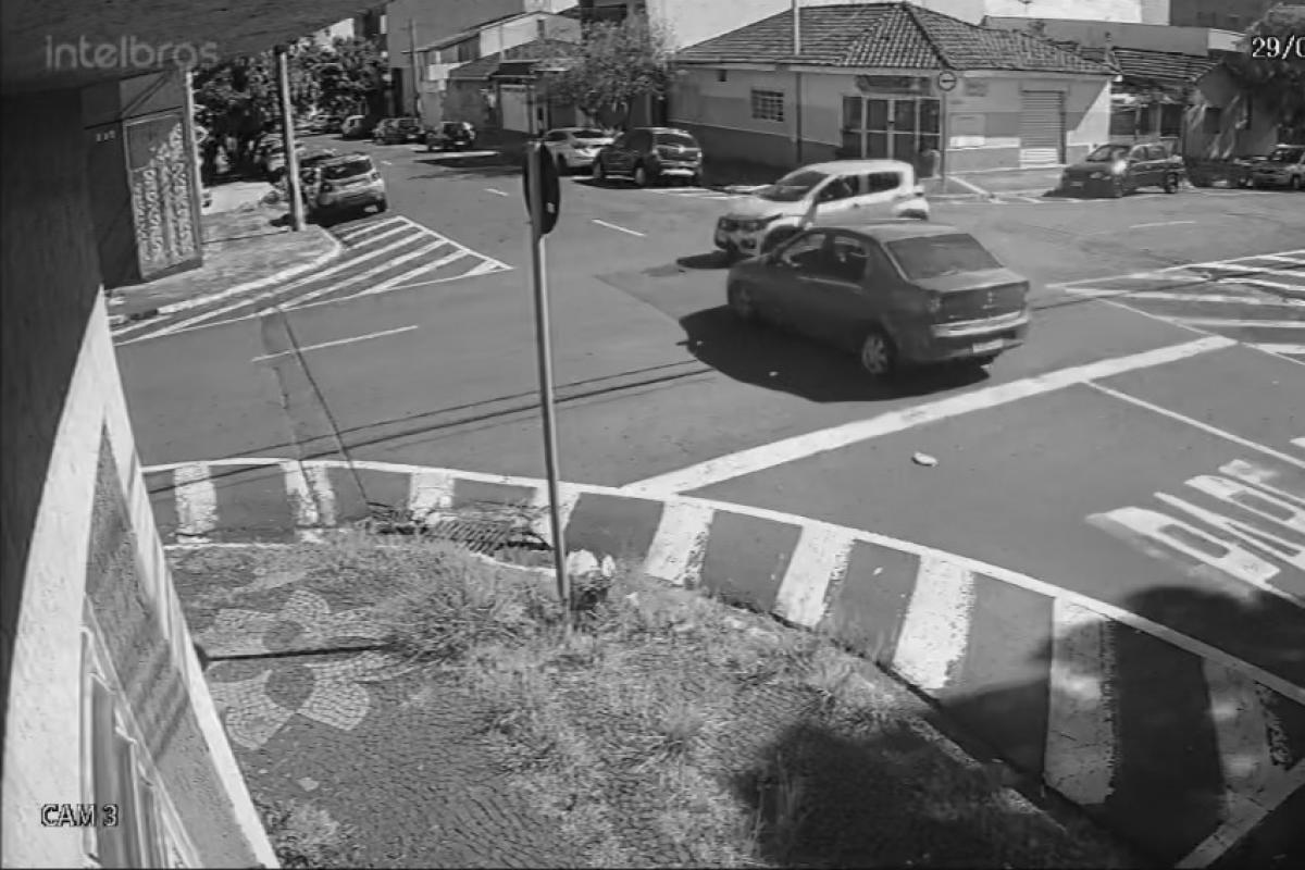Nas imagens, é possível ver o momento em que um Renault Logan segue em alta velocidade pela rua Major Mendonça e avança o sinal de pare no cruzamento com a rua Prudente de Morais.
