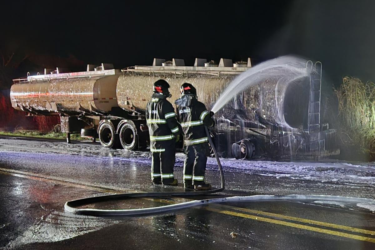 Bombeiros apagando incêndio de carreta carregada com etanol