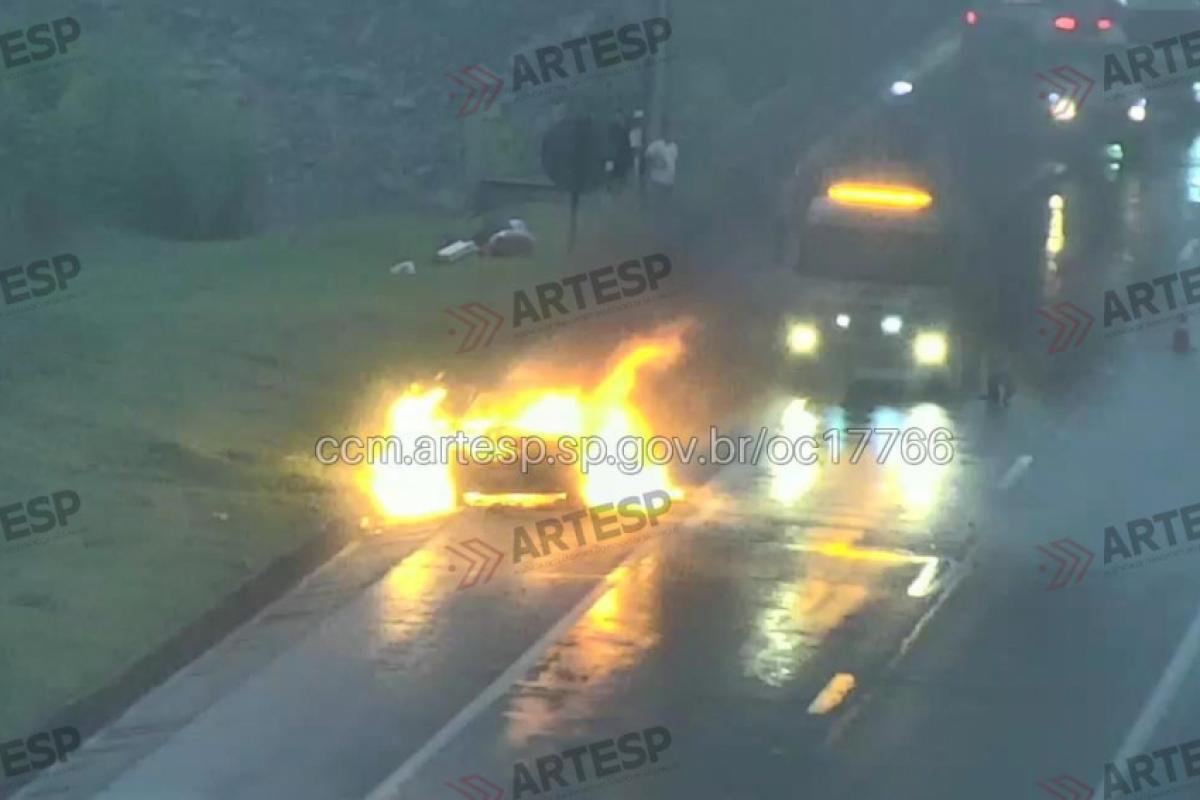 Incêndio na Tamoios consome veículo e para a rodovia