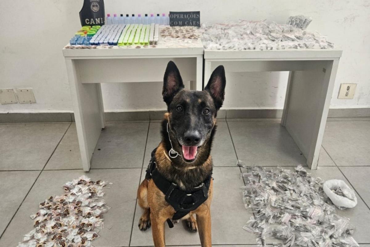 O cão farejador ajudou na localização das drogas no imóvel