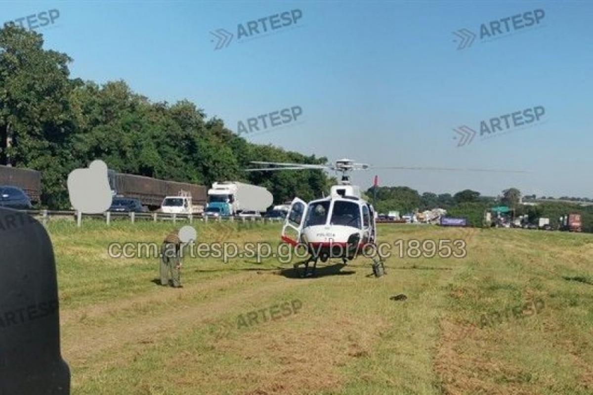 O Helicóptero Águia da Policia Militar pousou agora há pouco no canteiro central da rodovia dos Bandeirantes para resgatar vítima grave de um acidente registrado pela Agência Reguladora de Serviços Públicos Delegados de Transporte do Estado de São Paulo (Artesp), na tarde desta sexta-feira (17).