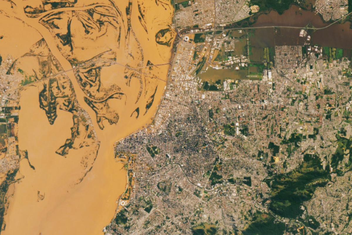 A Nasa divulgou na quarta-feira (8) imagens das enchentes que cobrem Porto Alegre, no Rio Grande do Sul, feitas pelo satélite Landsat 8. No registro, que cobre quase todo o perímetro do município, é possível ver as margens do Rio Guaíba, e parte da capital tomada pelas águas.