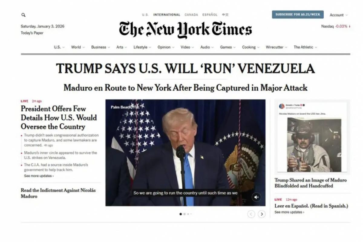 Um dos principais jornais dos Estados Unidos (EUA) – o New York Times (NYT) – publicou neste sábado (3) um editorial criticando as ações do governo de Donald Trump e chamando de ilegal o ataque à Venezuela. Para o jornal, o país sul-americano foi o primeiro alvo da nova doutrina de segurança da Casa Branca para América Latina.