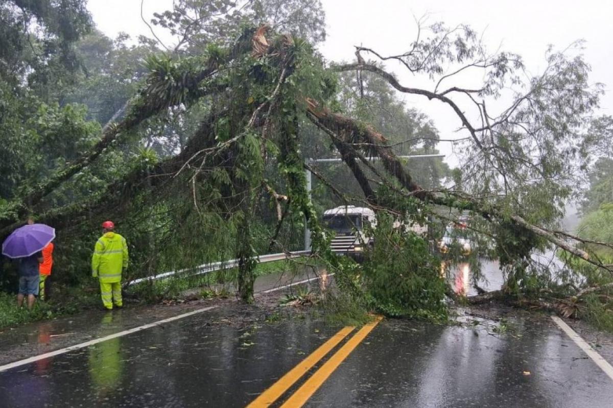 Conforme a Defesa Civil estadual, a queda de árvore provocou a interdição da rodovia Rio-Santos nesta segunda, em Itariri, no litoral sul paulista. No início da noite a estrada já havia sido liberada.