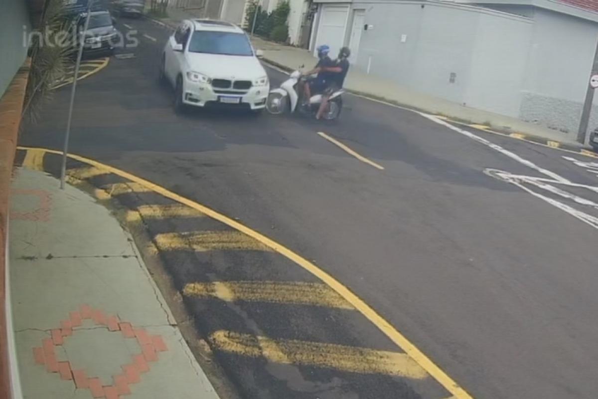 Nas imagens, é possível ver o motociclista com um passageiro na rua Presidente Kennedy. Quando ele chegou ao cruzamento, diminuiu a velocidade, olhou apenas para um dos lados e acelerou.