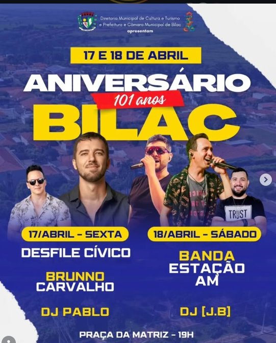 A Prefeitura de Bilac anunciou a programação especial em comemoração aos 101 anos de emancipação do município, que serão celebrados neste sábado (18). As atividades estão previstas para acontecer na praça da igreja matriz, com atrações distribuídas entre sexta-feira (17) e sábado.