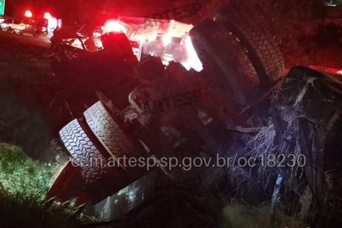 Carreta tomba, mata motorista e vaza solvente na SP 065