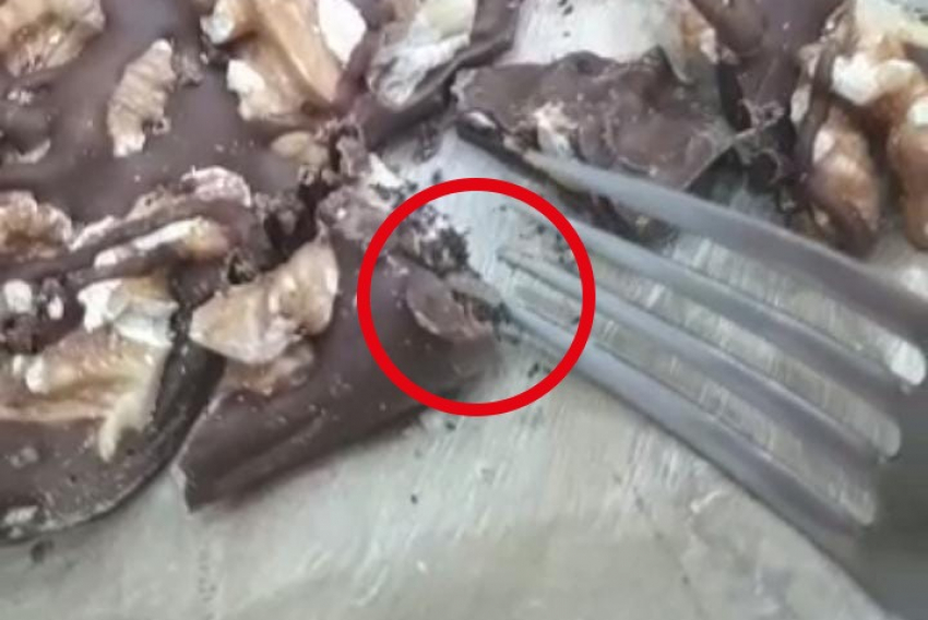 Incrédula, ela decidiu verificar se haviam mais larvas. "Eu peguei e coloquei em cima da mesa e com duas facas comecei a cortar o chocolate em pequenos pedaços para ver se encontrava alguma outra coisa. E quando eu comecei a desgrudar as nozes do chocolate, começaram a sair mais larvas e ovos de dentro do chocolate", disse ela, que completou. "Nesse momento eu peguei o celular e fiz um vídeo."