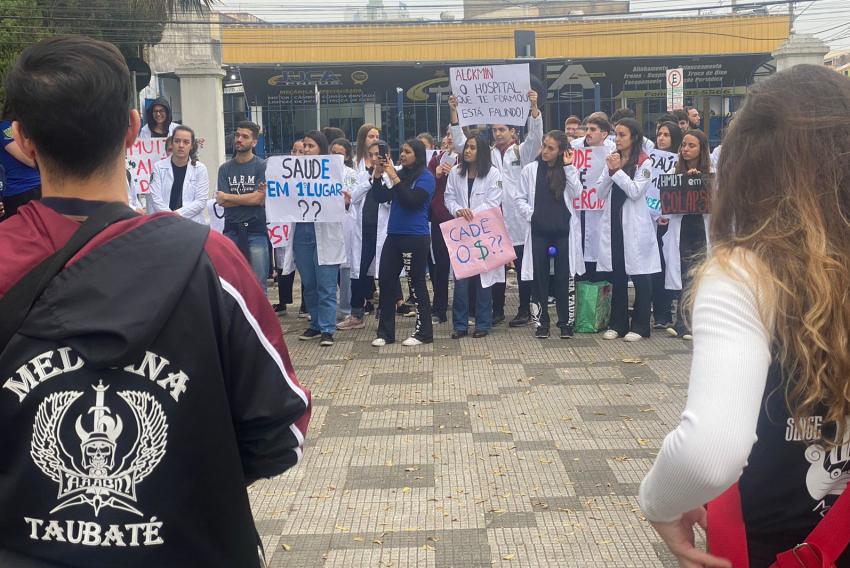 Alunos do curso de Medicina da Unitau (Universidade de Taubaté) realizaram um protesto na manhã desta terça-feira (18) em frente à prefeitura do município contra o atraso dos repasses da administração municipal à SPDM (Associação Paulista para o Desenvolvimento de Medicina), responsável por administrar o Hospital Municipal Universitário de Taubaté.