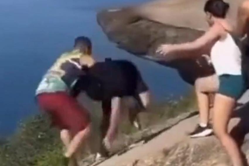 Um vídeo flagrou uma briga na Pedra do Telégrafo, localizada em Barra de Guaratiba, na Zona Oeste do Rio de Janeiro, e ganhou destaque nas redes sociais no último domingo (17). A briga quase resultou em uma tragédia. O registro mostra um homem expressando sua insatisfação com a conduta de outro homem que estava pendurado na pedra. Em seguida, ocorre um empurrão por parte de um dos envolvidos, levando o outro a puxá-lo pela bermuda. O jovem empurrado esteve à beira de cair de uma altura superior a 300 metros, mas foi salvo por intervenção do outro homem, que o segurou pelo braço.