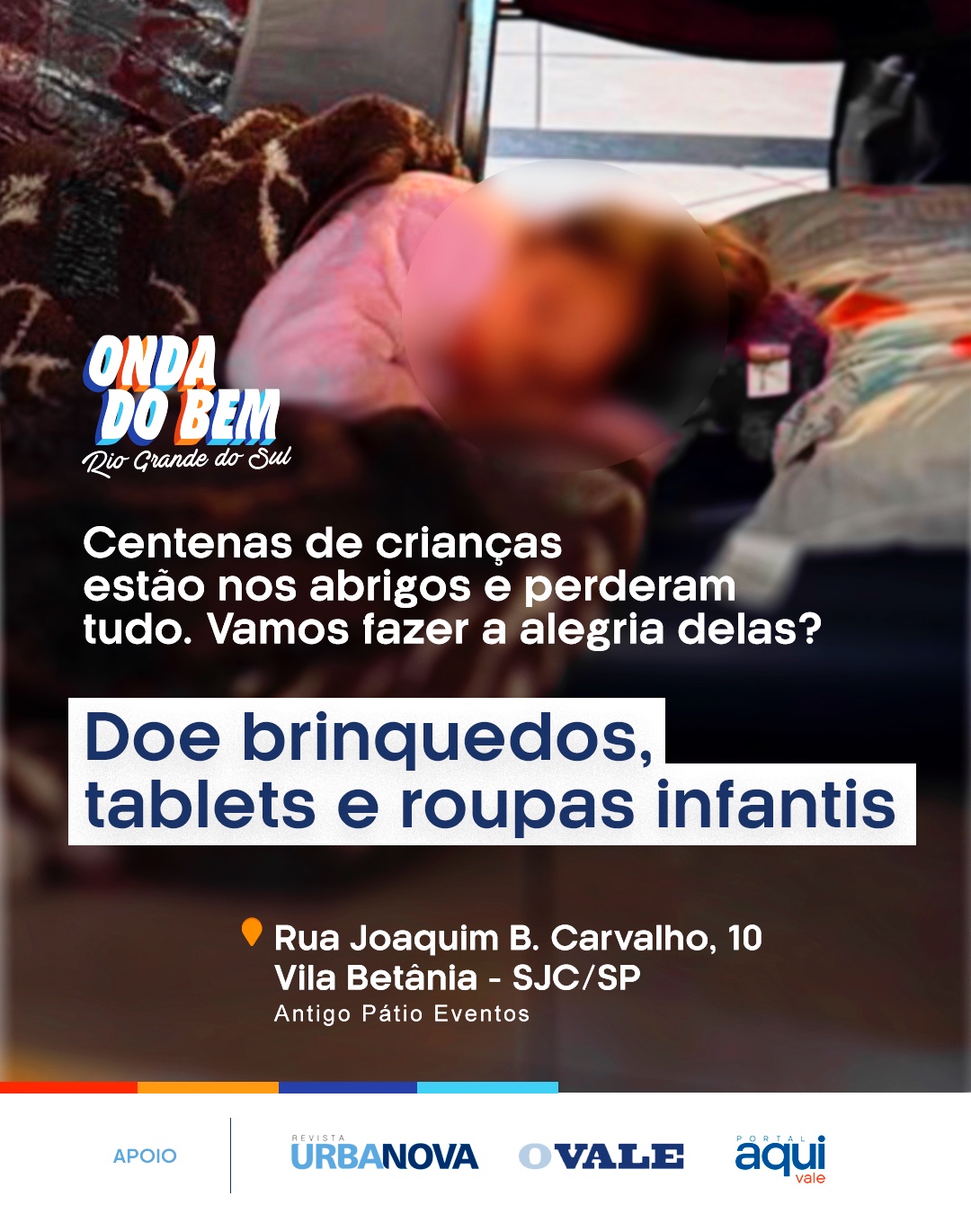 Após a mobilização por mantimentos e água que levou 20 carretas de donativos para o Sul, voluntários de São José dos Campos lançaram uma campanha para arrecadar roupas infantis, tablets e brinquedos. Trata-se do movimento ‘Onda do Bem’ pelo Rio Grande do Sul.