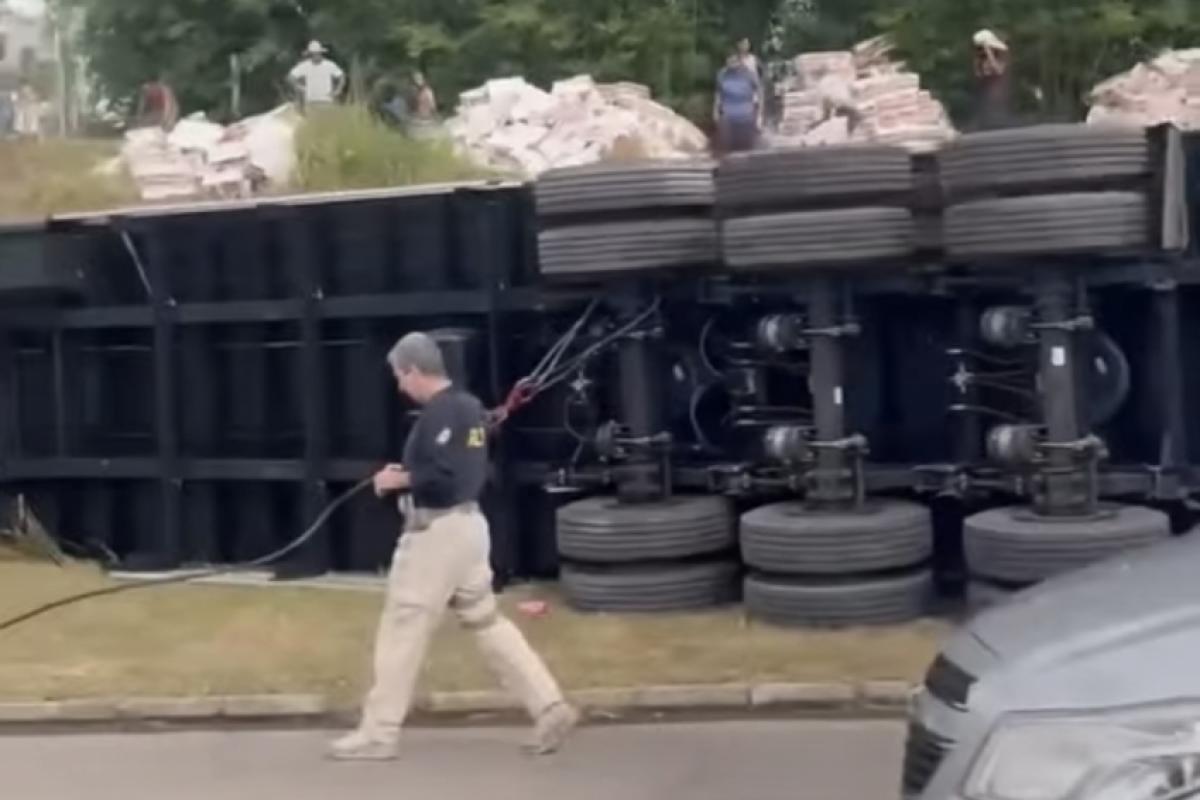 De acordo com informações preliminares, o motorista teria perdido o controle do veículo ao tentar pegar uma garrafa de água dentro da cabine. Apesar do acidente, não houve feridos.