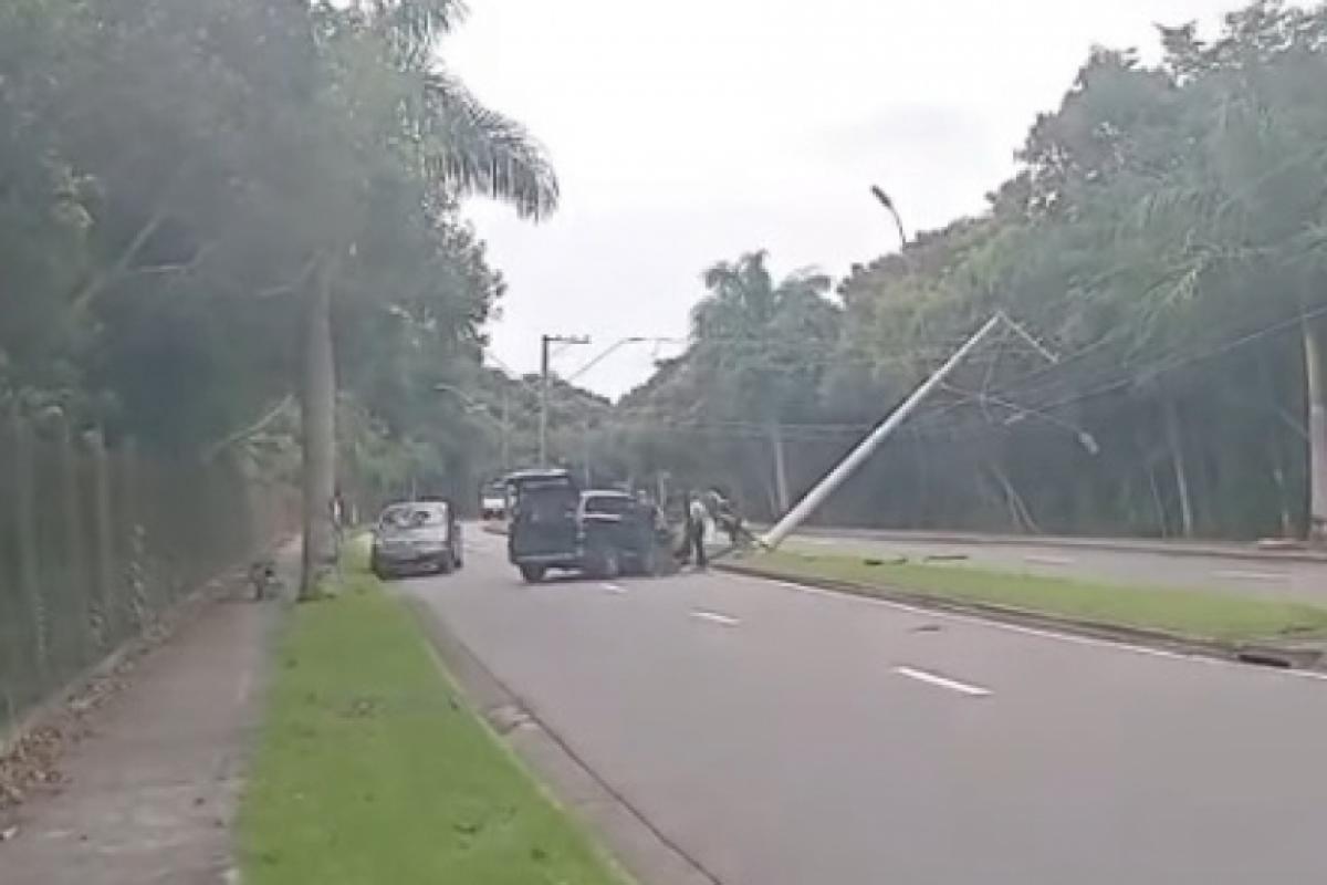 A avenida está interditada e a queda do poste afetou o fornecimento de energia na região.
