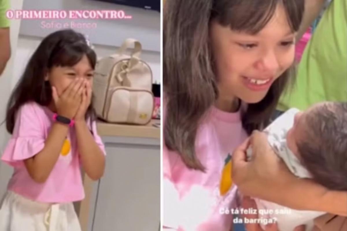 Bianca, uma recém-nascida em Anápolis (GO), parou de chorar ao ouvir a voz de Sofia, sua irmã de oito anos, durante o primeiro encontro entre as duas. O momento foi registrado em vídeo pela mãe, Gabriella Filgueira, na quinta-feira (1º). A gravação viralizou nas redes sociais após sua publicação e já acumula mais de 1,1 milhão de likes.