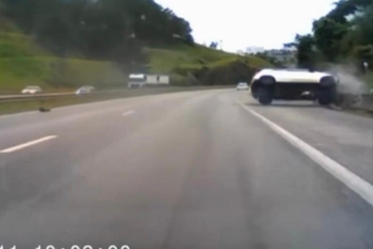 Imagens registradas por uma câmera instalada em outro veículo mostram o momento em que um Fiat branco ultrapassa pela faixa da esquerda, por volta das 10h08, atinge o guard rail, atravessa a pista e capota diversas vezes até parar no acostamento.