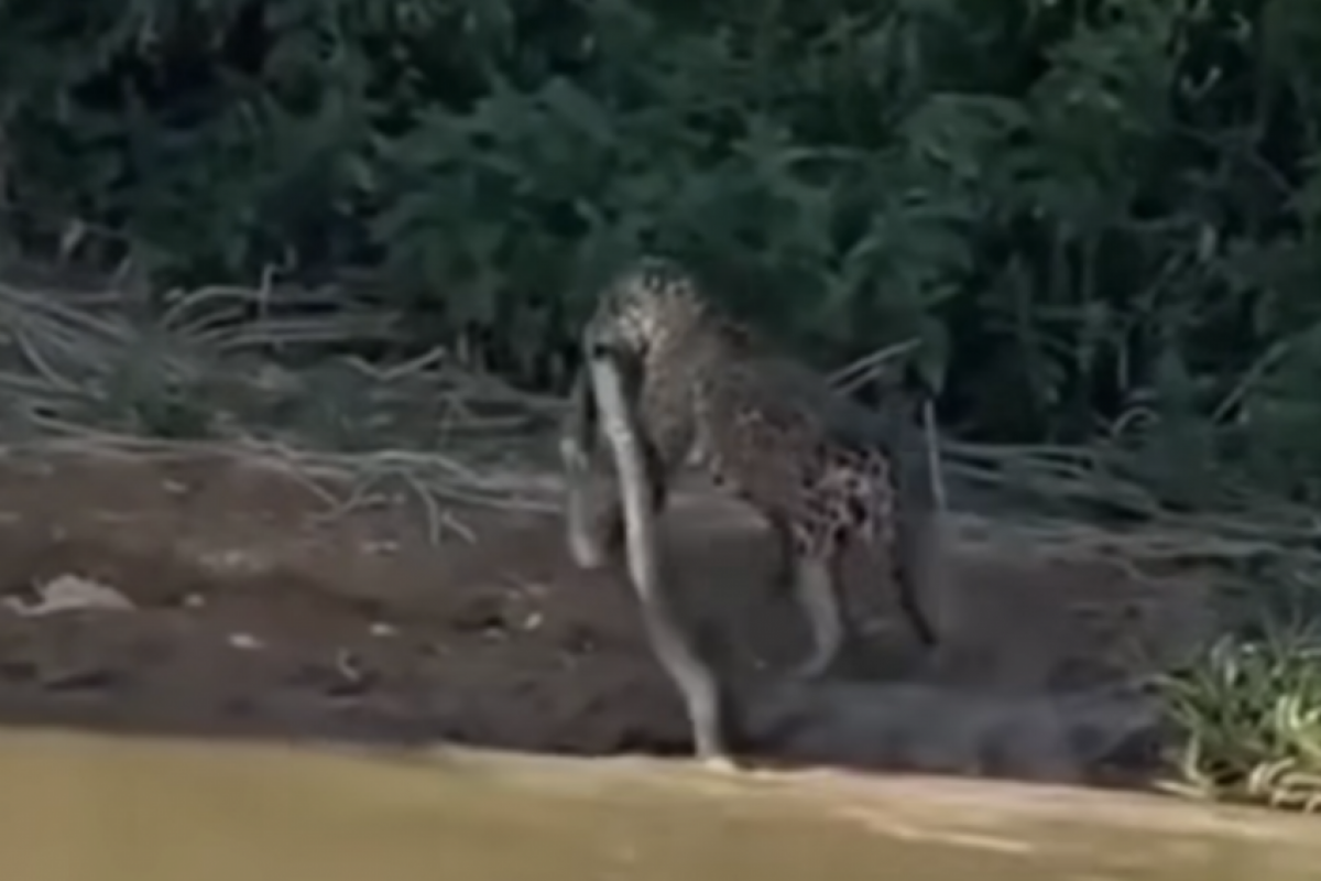 Um vídeo que está fazendo sucesso nas redes sociais mostra o momento em que uma onça-pintada surge das águas barrentas de um rio, no Pantanal, com um “prato” nada comum: uma enorme sucuri-amarela entre os dentes.