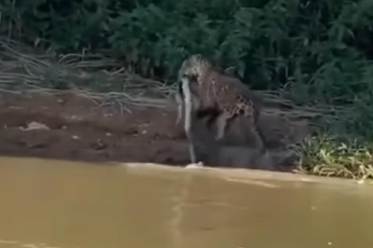 Um vídeo que está fazendo sucesso nas redes sociais mostra o momento em que uma onça-pintada surge das águas barrentas de um rio, no Pantanal, com um “prato” nada comum: uma enorme sucuri-amarela entre os dentes.