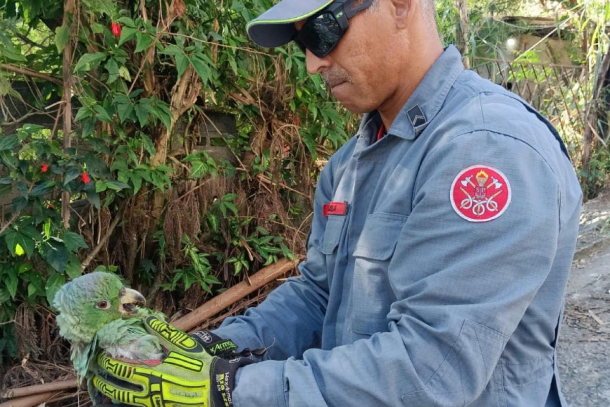 Bombeiro com o papagaio resgatado na árvore
