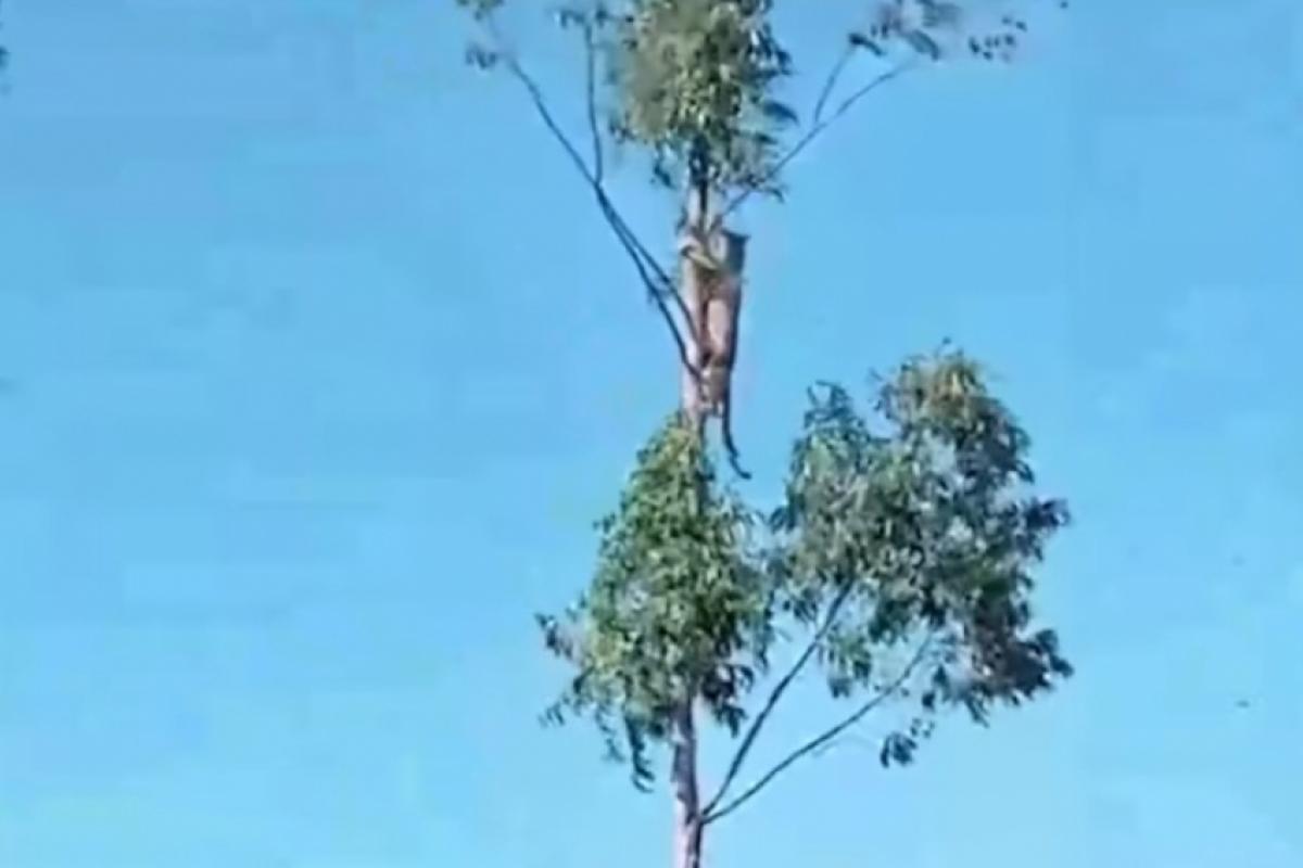 Onça-parda é flagrada escalando eucalipto em fazenda