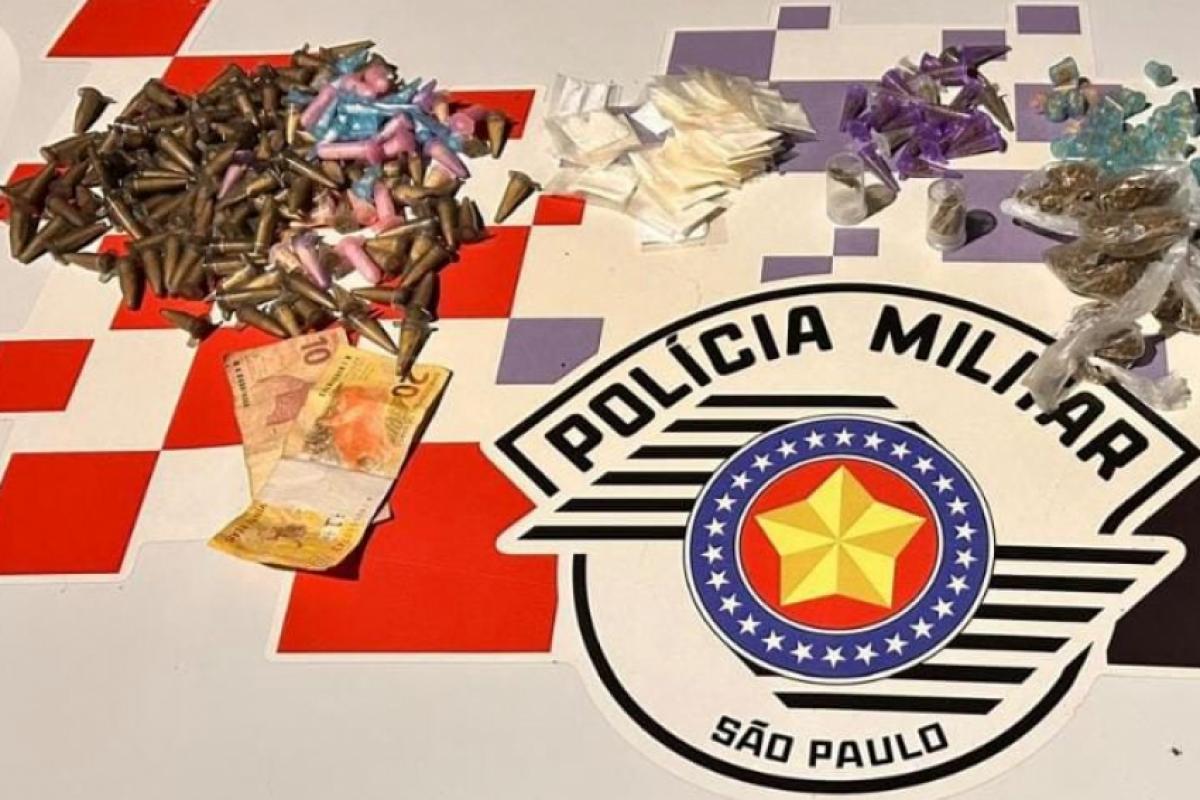 A equipe policial realizou a abordagem e localizou 216 porções de cocaína, 39 porções de crack, 15 porções de maconha, 23 porções de K9, um aparelho celular e R$ 30 em dinheiro.